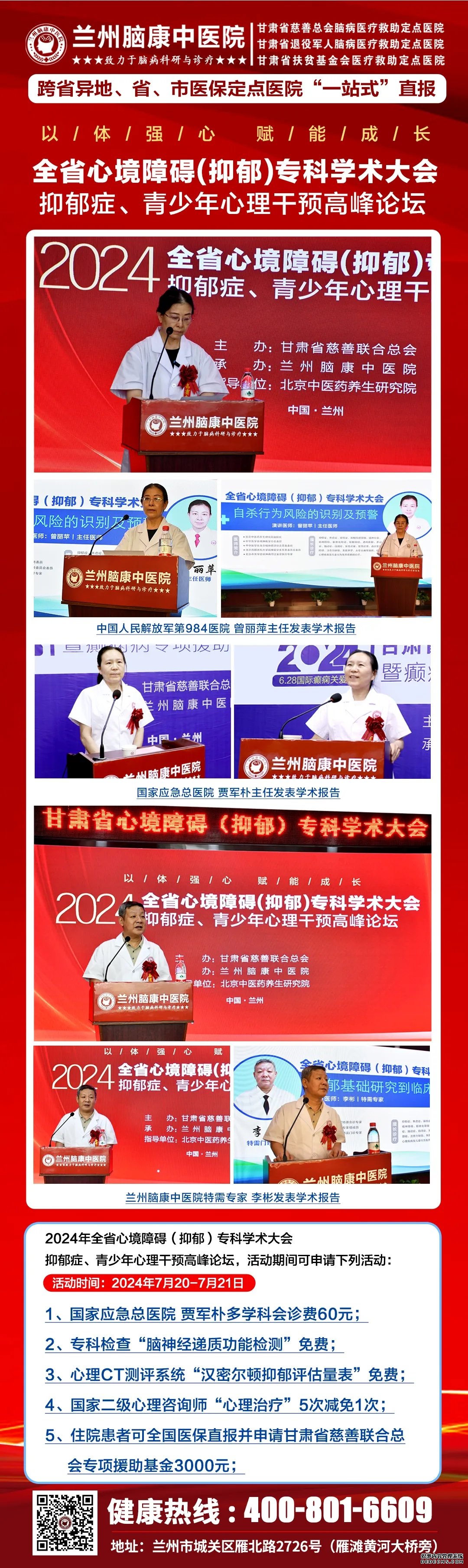暨2024年全省心境障碍(抑郁)专科学术大会,兰州脑康中医院响应甘肃省慈善联合总会抑郁症、青少年心理政策特设立并启动“全省心境障碍(抑郁)青少年心理援助项目”。让广大患者可以“近距离”进行科学诊疗,享受诊疗技术上新突破。